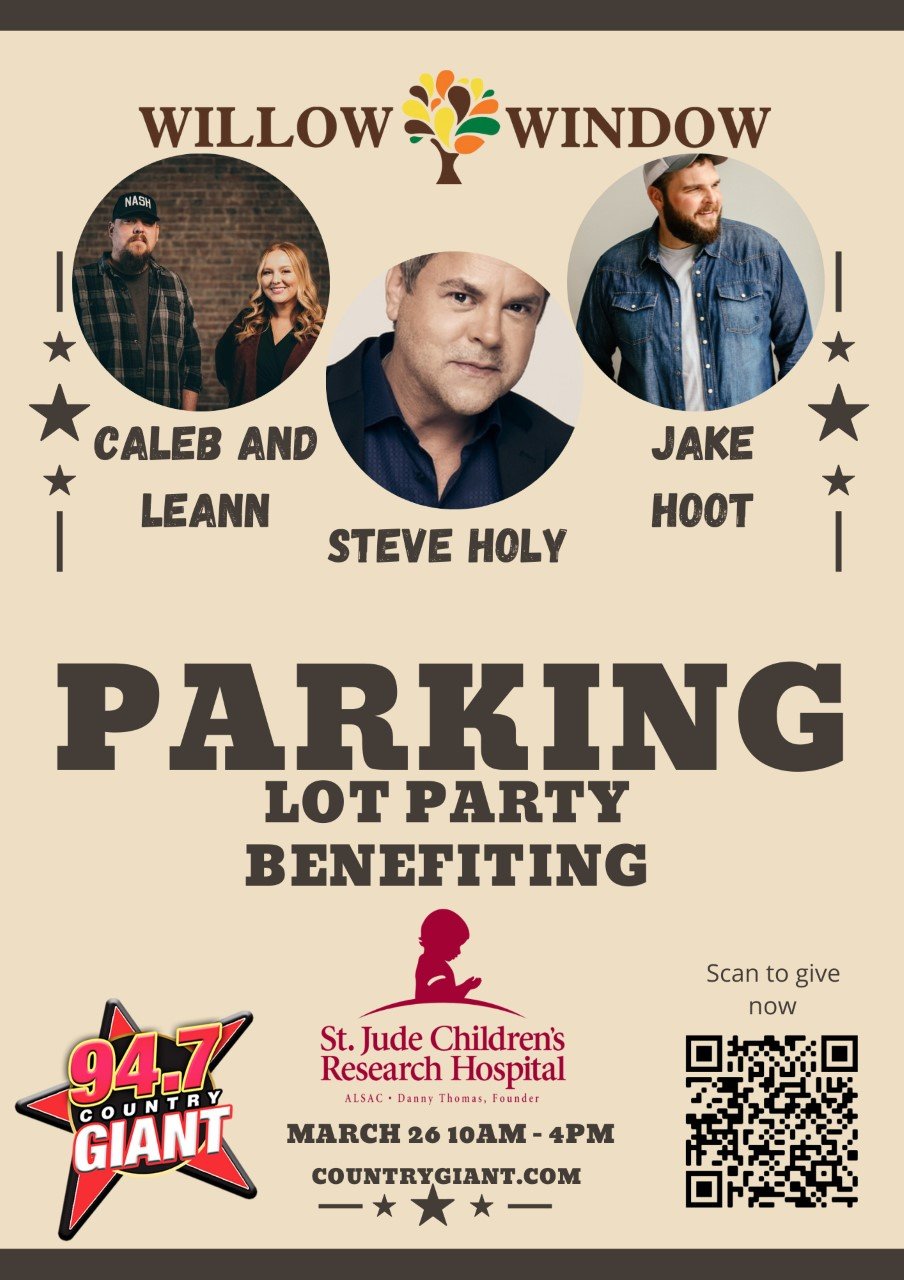 Willow Window and 94.7 Country Giant are extremely excited to announce a FREE Parking Lot Party benefiting St. Jude Children’s Research Hospital on Saturday, March 26.